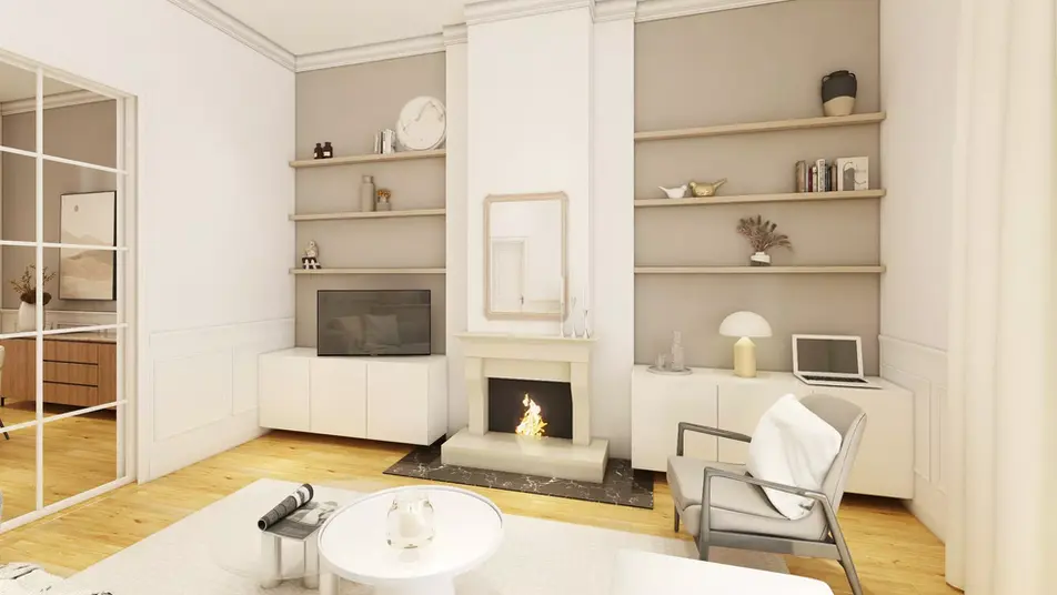 A noter le linéaire de rangements sur-mesure prenant place dans le salon, accompagné de ses étagères en chêne coupées de biais.